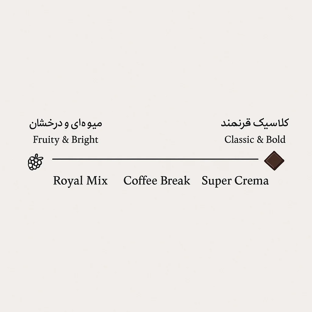 | ویژگی | میکس رویال (Royal Mix) | میکس کافی بریک (Coffee Break) | میکس سوپر کرما (Super Crema) |