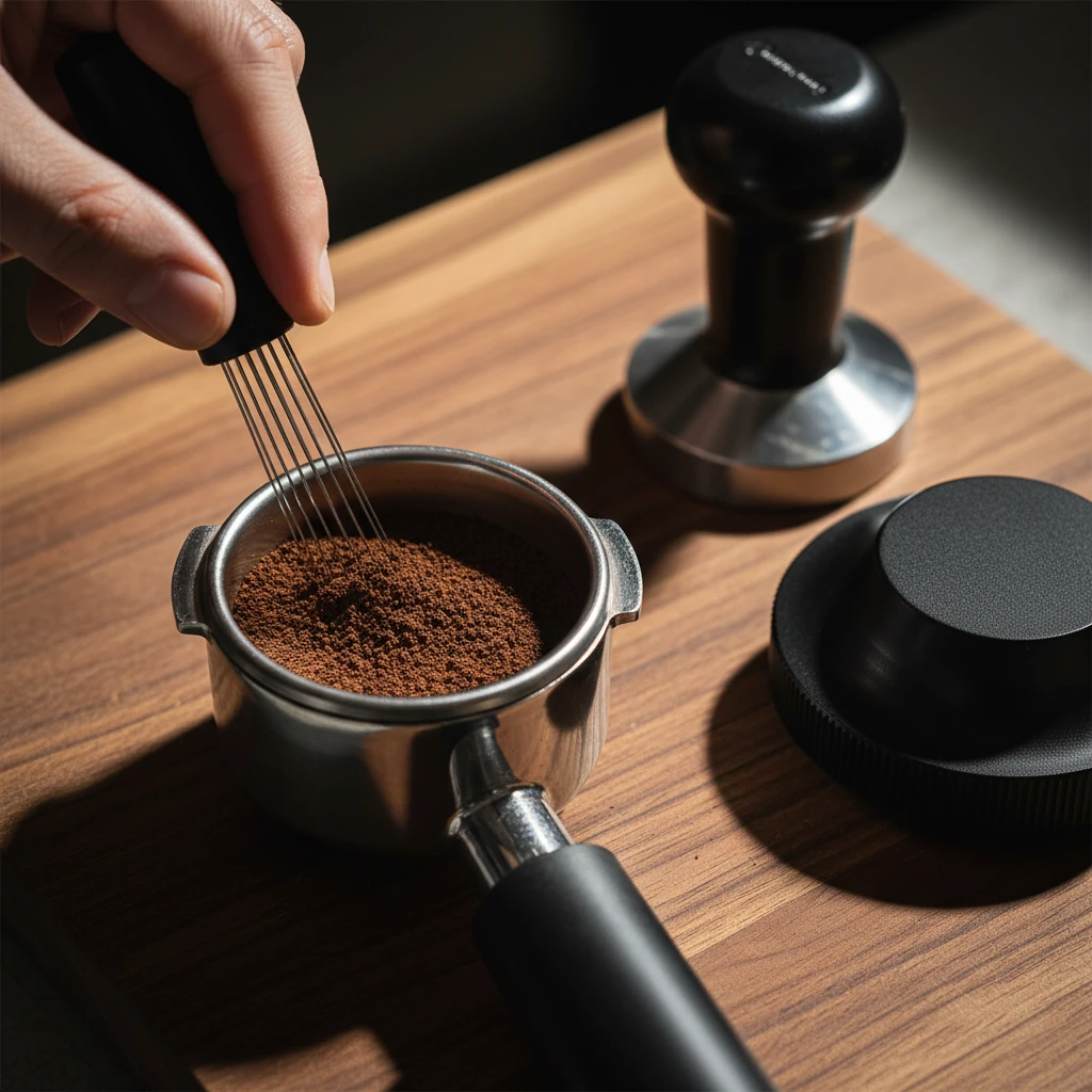 ابزار نجاتبخش: برای حل این مشکل، باریستاها از ابزاری به نام نیدل (WDT) فنری یا مگنتدار استفاده میکنند. با چرخاندن نیدل در پرتافیلتر، تمام گرههای قهوه باز شده و پودر کاملاً پوک و یکدست میشود. این یک تغییر کوچک با تاثیری شگفتانگیز است.