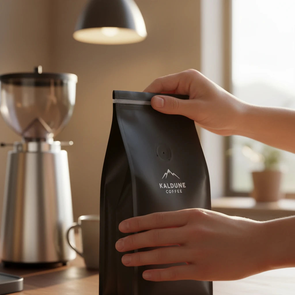 ما در کالدونه از پاکتهای چندلایه فویلدار استفاده میکنیم که نور و رطوبت از آنها عبور نمیکند. اما مهمتر از آن، وجود «سوپاپ یکطرفه» (One-way Valve) روی پاکتهاست.