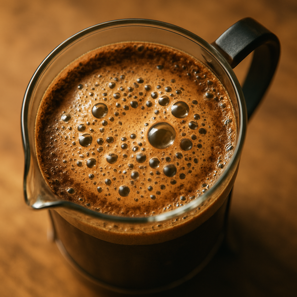 پس از ۴ دقیقه، با یک قاشق، به آرامی لایه قهوهای که در سطح جمع شده (به آن Crust یا کِرِم میگویند) را بشکنید. حالا اهرم (Plunger) را به آرامی و با ملایمت کامل به سمت پایین فشار دهید. اگر برای فشار دادن نیاز به زور زیادی دارید، یعنی آسیاب شما بیش از حد ریز است.